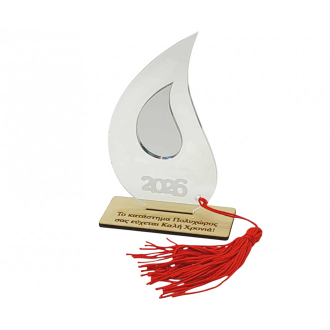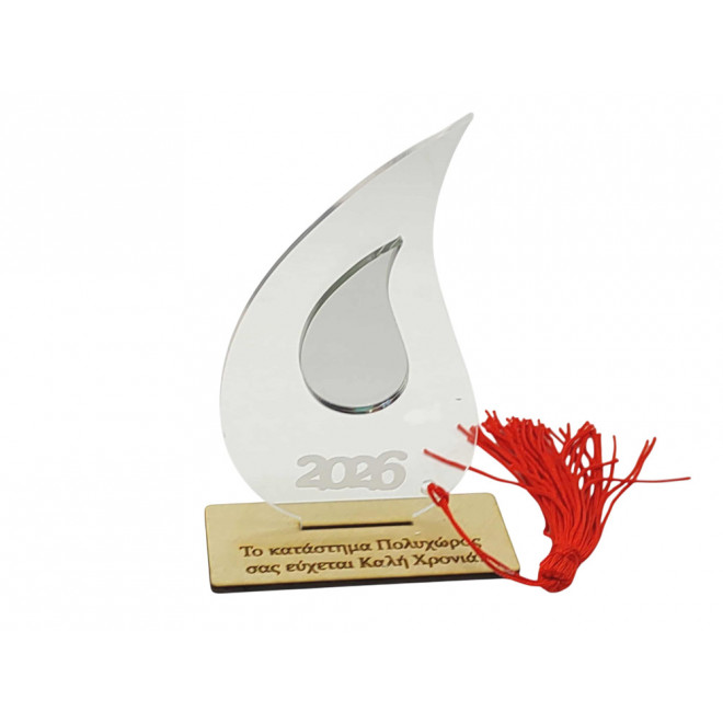 Γούρι σταγόνα από plexiglass διάφανο με ασημί σταγόνα καθρέπτη στην μέση με χαραγμένη την χρονολογία από κάτω και φούντα κοκκίνη, επίσης ξύλινη βάση με αφιέρωση της επιλογής σας. Με διαστάσεις 12 x 7 εκ.